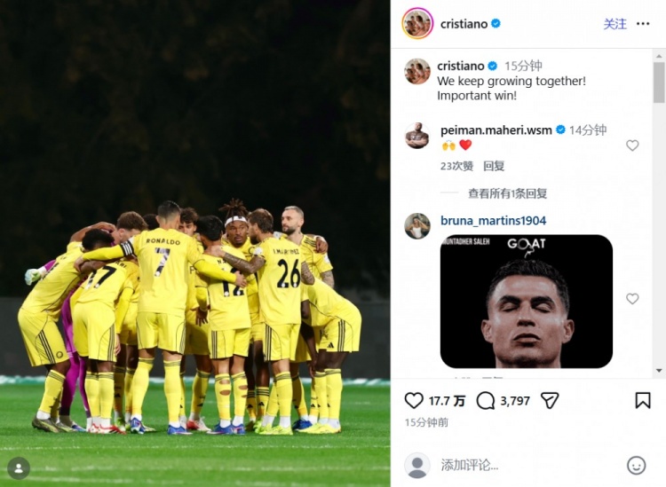赛后,C罗在社交媒体上写道:我们携手共进,这是一场非常重要的胜利。